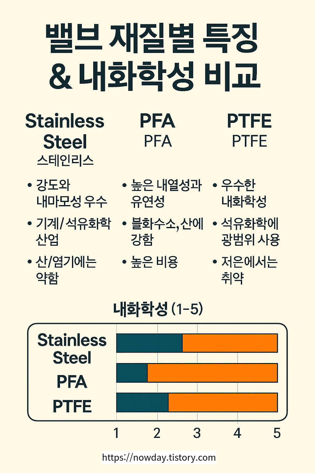 이번 포스트에서는 현장에서 자주 사용되는 4대 주요 재질의 특성과 내화학성 비교를 정리합니다.
